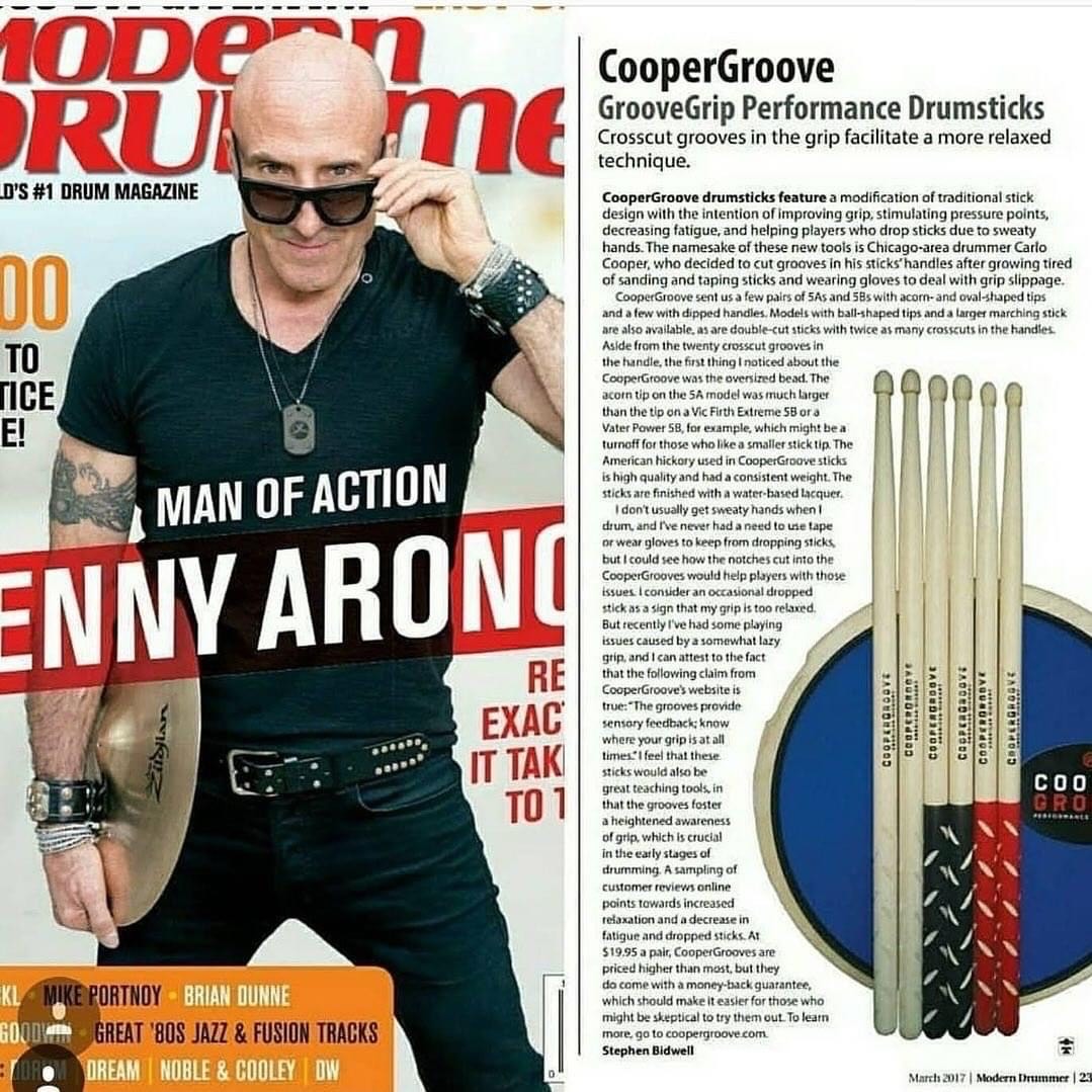 I have been using “Cooper Groove” sticks , exclusively for the last year or so. Absolutely love them! They are the best sticks I have used in years! Very comfortable to play with and keep my hands from becoming fatigued. I love the way the Grooves massage your hands as you do your thing. And the confidence of not losing a stick in the middle of a fill etc. , is awesome! I have pairs of the Pearl tips , wooden tips , and the dipped ones , and I enjoy playing with all of them. Do yourself a solid , and try these if you haven’t already. Carlo has really done a fantastic job with these sticks! I can’t say enough positive things about Carlo and his wonderful product! Well done my friend!